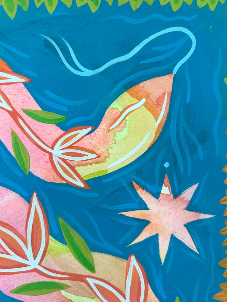 Painted with watercolor and acrylic on watercolor paper. Approx 9x12